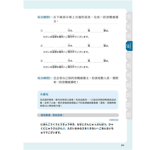 挑選實用且生活化的學習內容,包含日本城市名稱、機場用語、數字、登機廣播、機艙點餐等等,要你立即運用。