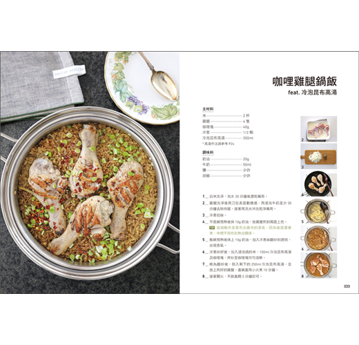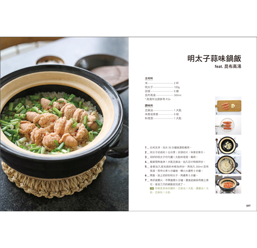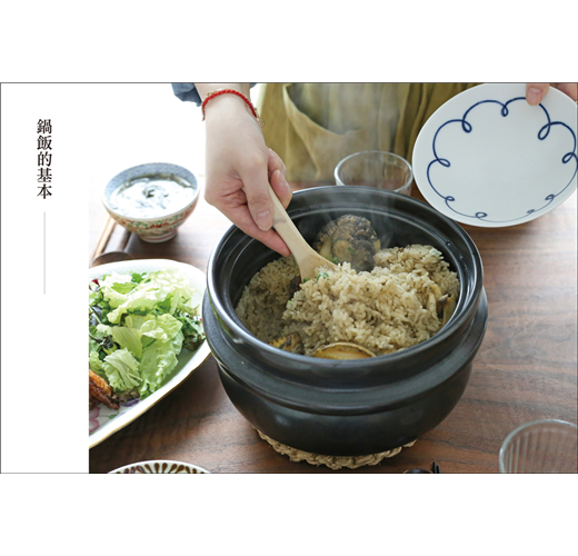 鍋飯的食材沒有限制,選擇自己喜歡的配料,用玉米、茄子、絞肉等冰箱常見食材,或是季節性的南瓜、鮑魚、淡菜都可以,善用昆布、蛤蜊、小魚乾等「快速高湯」當鮮味基底,無時無刻美味上桌!