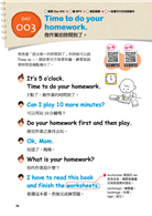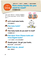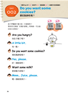 在本書的許多會話內容中,也收錄了可以引導孩子跟爸媽一起做互動的對話內容。像是一起玩遊戲的對話句、一起動手做菜的對話句、進行角色扮演(如點餐、講電話)的對話句,增加爸媽與孩子更多的情境式互動學習。