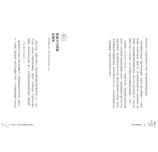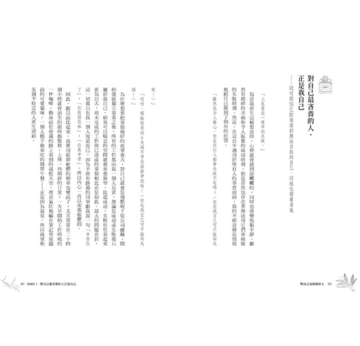 在這個世界上,與自己最親近的人明明就是自己,我們卻把無數的枷鎖扣在自己身上,試圖根據角色、地位、性向,輕易評斷或否定自己──「因為我是女兒」、「因為我是女生」、「反正我就是缺乏毅力」、「我就是禁不起誘惑」……在那些言語中,究竟有多少自我被囿限了呢?如果能認知到「人是會不停變化的」,停止持續的習慣性判斷,就不會造成內傷,人際關係也會更舒服自在!
