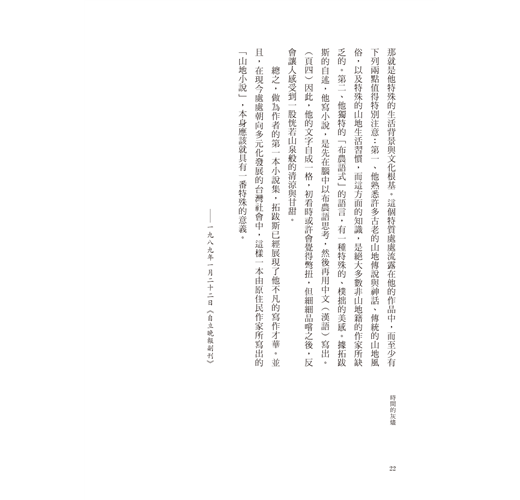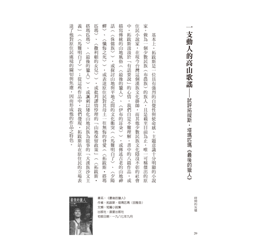 最初的〈一支動人的高山歌謠──試評《最後的獵人》〉是我就讀淡江大學中文系大四時修李瑞騰老師課的作業,他推薦給時任《自立晚報副刊》主編的林文義先生,刊登在當時的「自立書評」專欄。感謝兩位先生的提攜,他們願意讓一位大學生發表書評,對當時的我是莫大的鼓勵。