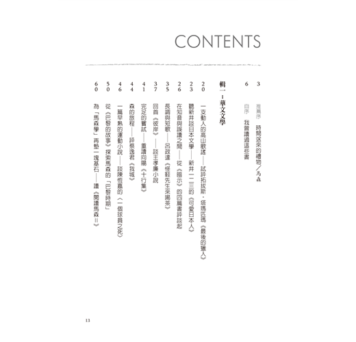 我讀書的範圍很窄,十之八九都是文學。但因為文學的範圍很大,因此我讀的也很雜。(若依羅蘭‧巴特的說法,文學是一切學科的總和,「因為一切學科都出現在文學的紀念碑中」。)近三十年來,我雖能掌握文學界的流行話題以及文學理論的潮流,但很少參與討論,通常也不感興趣。眾多人正在讀的書,我往往刻意避開。這本書雖然有談大作家,如村上春樹,但也討論妮娜‧貝蓓洛娃這位在台灣毫無名氣的作家。沒什麼體系,但這是我的讀書方式,身在學術界,我很慶幸能自由自在讀了這些書。
