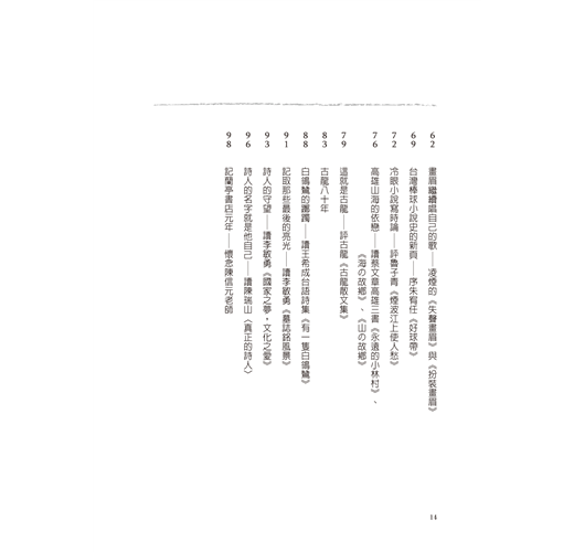書中各篇曾分別發表在《自立晚報副刊》、《中國時報‧人間副刊》、《中國時報‧開卷版》、《中央日報副刊》、《聯合報副刊》、《聯合報‧讀書人版》、《文訊》、《更生日報‧四方文學週刊》、《全國新書資訊月刊》、《自由時報副刊》、《中時晚報‧時代副刊》、《台灣時報副刊》、《台灣時報‧藝文天地版》……等處,謹向這些園地以及主編者致上誠摯的謝意。其中有多個園地已在這些年陸續消失,也是無可奈何的人間事。