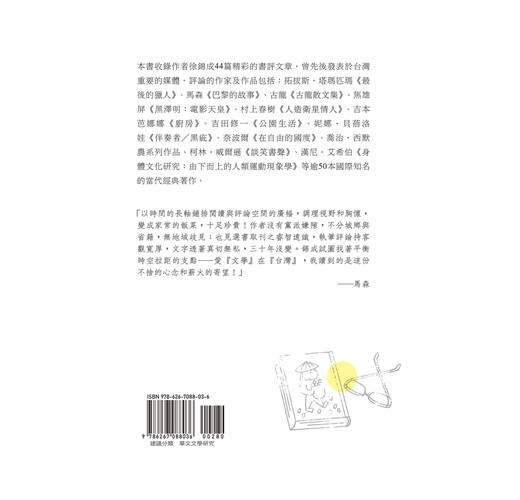 本書收錄作者徐錦成44篇精彩的書評文章,曾先後發表於台灣重要的媒體。評論的作家及作品包括:拓拔斯‧塔瑪匹瑪《最後的獵人》、馬森《巴黎的故事》、古龍《古龍散文集》、焦雄屏《黑澤明:電影天皇》、村上春樹《人造衛星情人》、吉本芭娜娜《廚房》、吉田修一《公園生活》、妮娜‧貝蓓洛娃《伴奏者/黑疵》、奈波爾《在自由的國度》、喬治‧西默農系列作品、柯林‧威爾遜《談笑書聲》、漢尼‧艾希伯《身體文化研究:由下而上的人類運動現象學》等逾50本國際知名的當代經典著作。