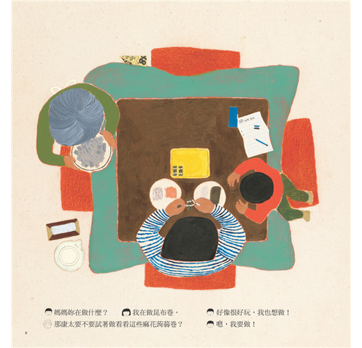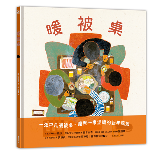 書中的暖被桌未曾被家人特別放大點出過,而是理所當然地存在於這個家之中,默默連結著所有人。藉由暖被桌保暖、團聚的功能,共享彼此內心的凝聚和溫馨。並在感受新年氣氛之餘,也能觀察台日新年文化異同的趣味之作。