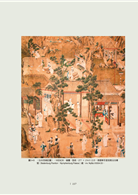 與上述〈鶯鶯聽琴圖〉類似,此套扇屏圖無論情節發生在室內或室外,都用一些大大小小,置於几上的盆景做為周遭環境的擺飾,甚至把花園風景也安排成放大的盆栽,做為背景,如〈佳期〉一圖(圖4-4)。花盆內栽花、種樹,並有奇石、蘭葉、花草等象徵富貴、長壽的吉祥圖案,以此烘托春節歡欣的氣氛和典雅的陳設。盆栽藝術源於中國,可朔源至史前時期。唐、宋以來,盆景成為宮廷、貴族、文人、雅士的陳設珍品,擺設在幽齋雅室之內。清代盆景的製作更是盛況空前,論述著作逐漸繁多,對盆栽藝術,造型技術等方法都有詳盡的介紹,促進盆栽的普及。