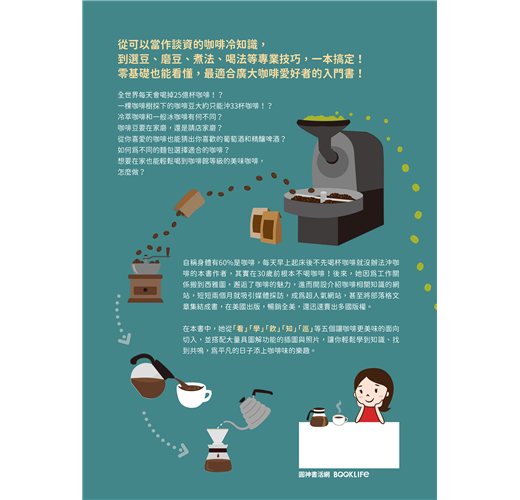想要多了解咖啡,但市面上的咖啡書太艱難、太科學或太細節,讓你卻步?這種心情作者完全懂!所以,這不是一本充滿艱澀術語的技術流咖啡書。在本書中,她從「看」「學」「飲」「知」「巡」等五個讓咖啡更美味的面向切入,並搭配大量具圖解功能的插圖與照片,讓你輕鬆學到知識、找到共鳴,為平凡的日子添上咖啡味的樂趣。