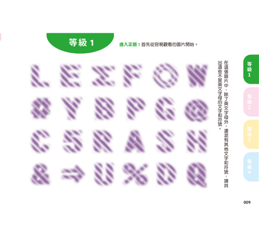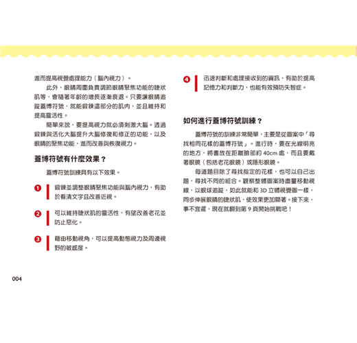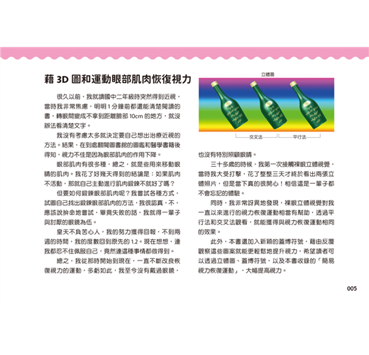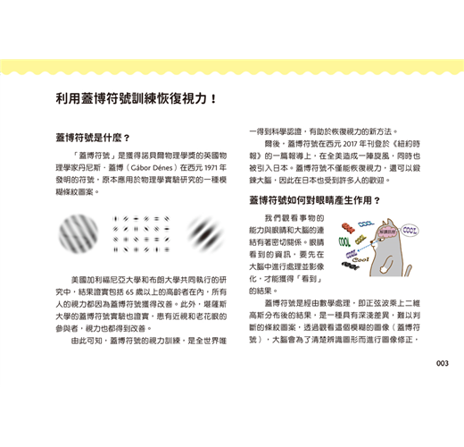 書中收錄110張原創圖形,根據理論基礎,經過蓋博轉換處理,利用色彩、線條與圖案的特殊編排,藉此反覆觀察這些圖案,就能輕鬆提升視力,改善視力問題。