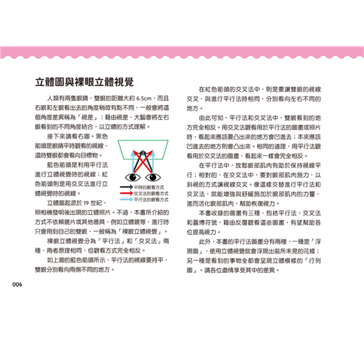 如此交替平行法與交叉法,就能增強與舒緩施加於眼部肌肉的力量,進而活化眼部肌肉,幫助恢復視力,也能看見圖畫中浮現前所未見的立體圖樣!