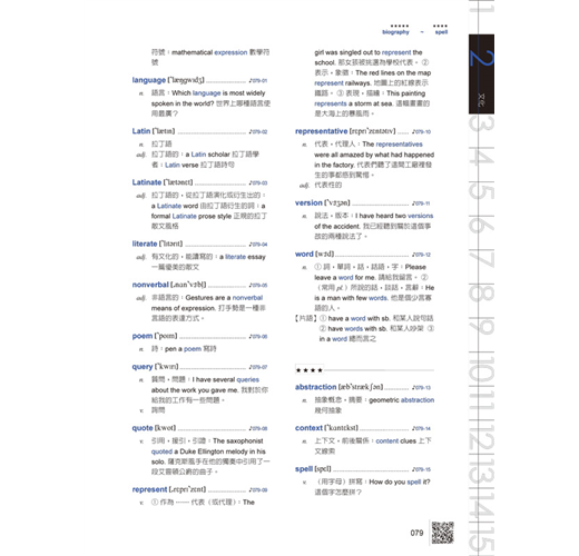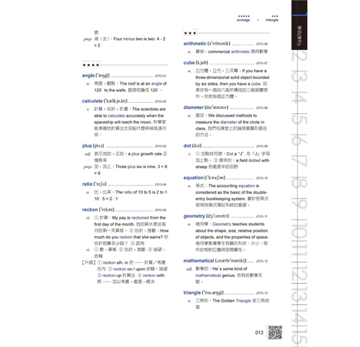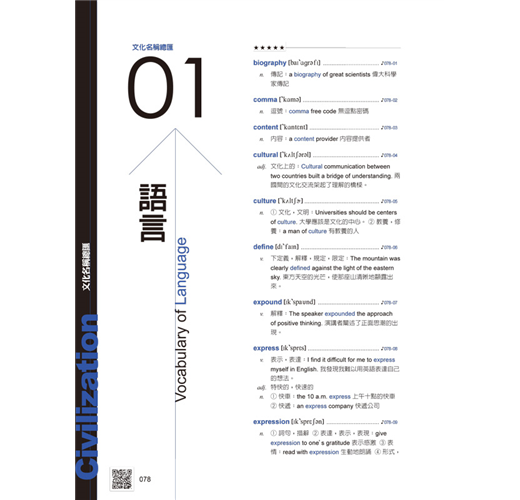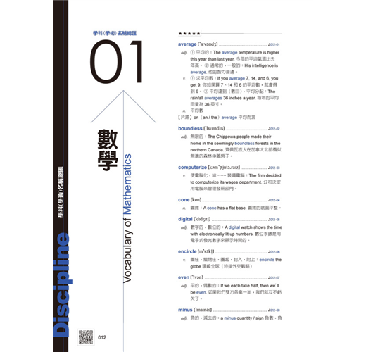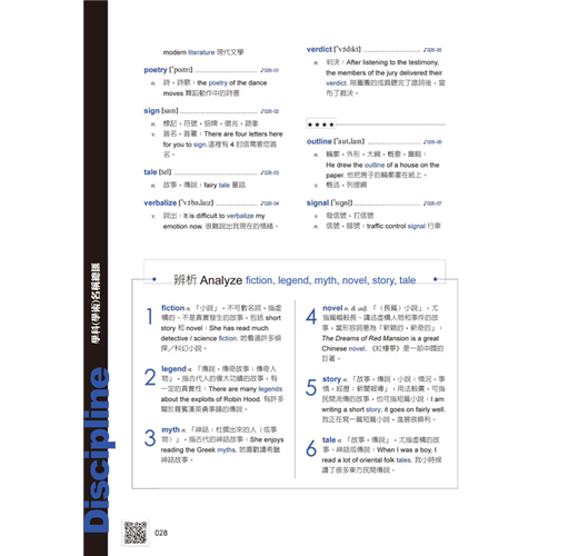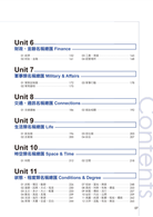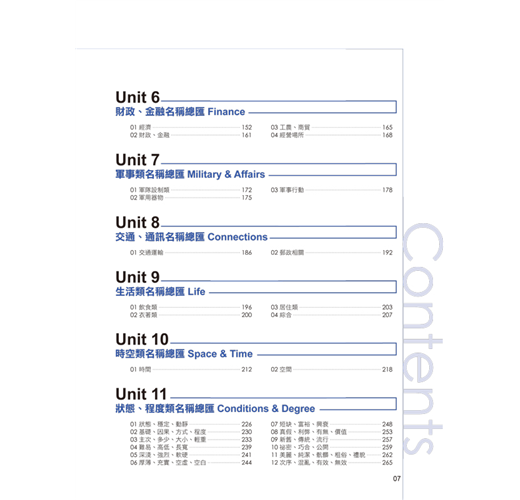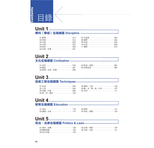 本書以主題式分類,收錄學科(學術)、文化、技術工程、教育、政治與法律、財政與金融、軍事、交通與通訊、生活、時空、狀態與程度、運動與變化、肢體動作、情感與心理、人際互動……等領域共5,400多個單字。