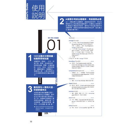 本書各個主題的單字依照5顆(★★★★★)至1顆(★)依序排列,讓考生不用花費大量時間記根本不會考的單字,也可以依據考試準備時間的多寡,讓考生自行決定需要背多少星級的單字量,高效提升準備成效!