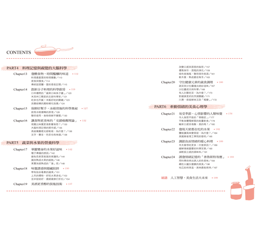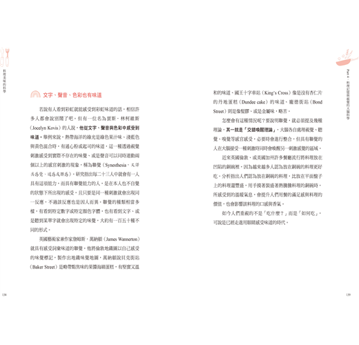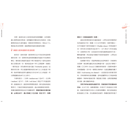 無論是麵包烘焙、甜點冰品、咖啡沖煮、紅酒品嚐、蔬果沙拉、肉品煎烤……,書中都將透露各式各樣美食背後的關鍵奧秘,包括了梅納反應、熱傳統效應、酸化效用、營養保存,甚至攸關心理學的季節效應、擺盤視覺、味道記憶等等,都能給你煥然一新的閱讀感受。例如: