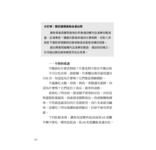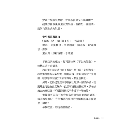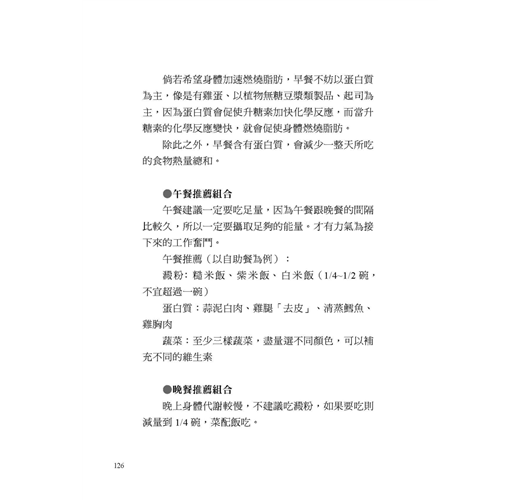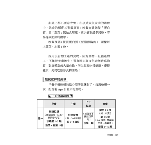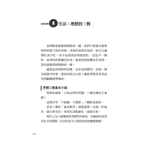 本書告訴我們,減重真的很簡單,同時也提供貼心的食譜建議,只要從三餐著手就可以帶來明顯的改變。例如,針對高油高熱量的食物,只需改變一下烹飪的方式,減重餐就可以好吃又無負擔。