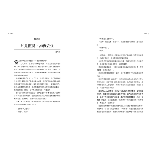 這本書藉由瑜伽哲學與體位法的教導,點出瑜伽練習不只在墊子上,而是要使生命成為一場流動的藝術。