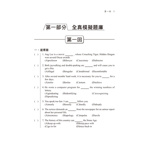本書第一部分精編30回全真模擬題庫,每回內容包括選擇題(字彙、文法)、克漏字、閱讀測驗三個部分,針對難題附上解析,透過解析掌握重要、常出的考點,強化你的應考實力!