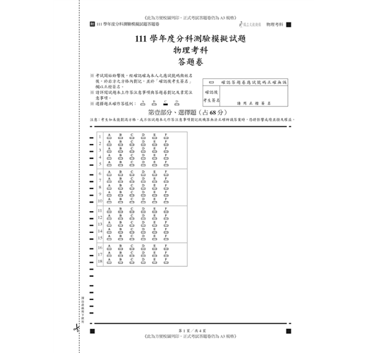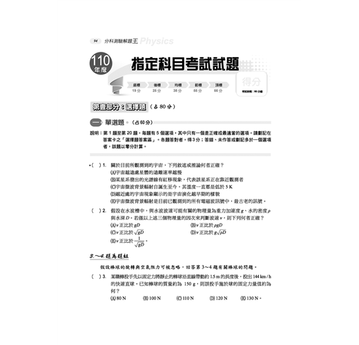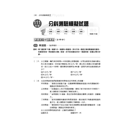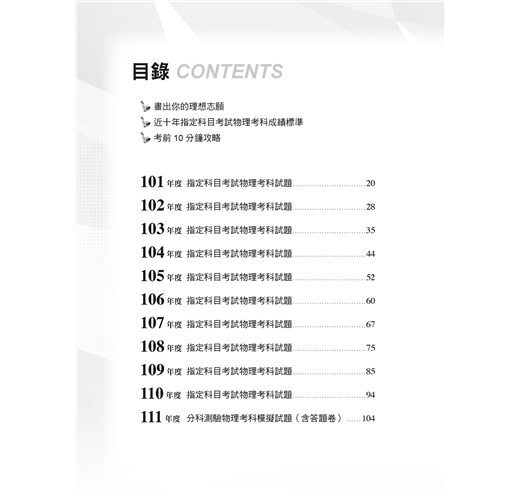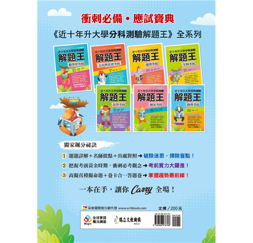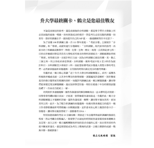 分科測驗取代了原來的指考,由原本的十科縮減成七科,目的在檢視同學是否具有大學校系所要求的學科的深廣能力。且在採計科目上,各校系會從學測、分科測驗、術科考試中取3至5科作為採計科目,分科測驗至少採計1科,想依循「考試分發」進入理想大學的話,分科測驗的準備必然不能鬆懈。有鑑於此,本系列收錄近10年歷屆試題,除了鑑往知來,還提供同學最充分的演練題庫,相信在經過10年份的歷屆試題洗禮下,自身實力能更上一層。