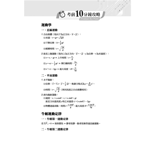 收錄考前10分鐘攻略,依據近十年出題率及最新課綱強弱化程度,將大考測驗範圍內的必考觀念重點編入,期望學子在最短時間內能掌握重要基礎概念及定理。