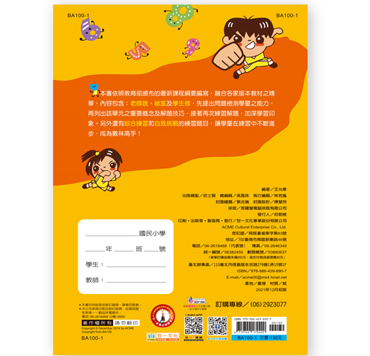 本書依照教育部頒布的108 新課綱編寫,融合各家版本教材之精華,有助於迅速升國小學童之數學能力運算能力。各單元內容包含:「老師說」、「祕笈」及「學生做」,先提出問題檢測學童之能力,再列出該單元之重要概念及解題技巧,接著再次練習解題,加深學習印象。另外還有「綜和練習」和「自我挑戰」的練習題目,讓學童在練習中不斷進步,大大強化數學實力!