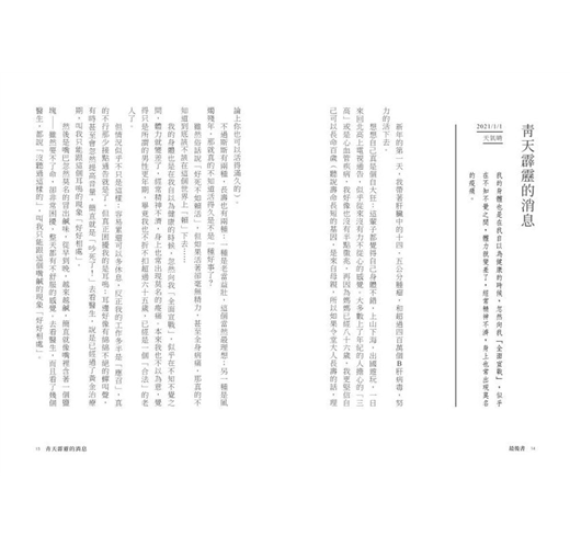 第一次讀到日記,是在二○二一年一月二十六日的下午。那天下午作家剛好北上,我們約在臺北車站碰面。其實也沒說具體要談些什麼。不過前一個月,他才因健康因素取消三場《煩事問莊子》新書講座,當時我還不知具體原因,於是對我而言,見面只想關心其近況。