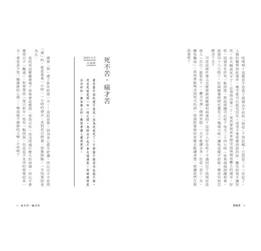看來最可怕的還不是死,因為死就死了,不管接不接受你也跑不掉,而且死就是那一呼一吸之間,為時似乎也不會太過漫長;而病痛卻是分分秒秒、無休無止的,難怪會讓人覺得更苦。