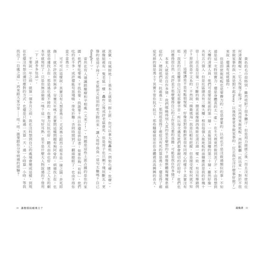 可不可以這樣說:其實沒有人想當勇士,尤其勇士跟烈士根本是一線之隔,非死即傷—就不許我與世無爭、安養天年嗎?其實問這種問題有夠阿Q的,病痛找上你,也就是命運找上你,那是逃也逃不掉的,你奮力反抗也好,聽天由命也好,總之人生的劇本早就寫好了,只是你無法偷看(咦?這一句好耳熟,是不是什麼大人物說過的?借用一下,請多多包涵)。