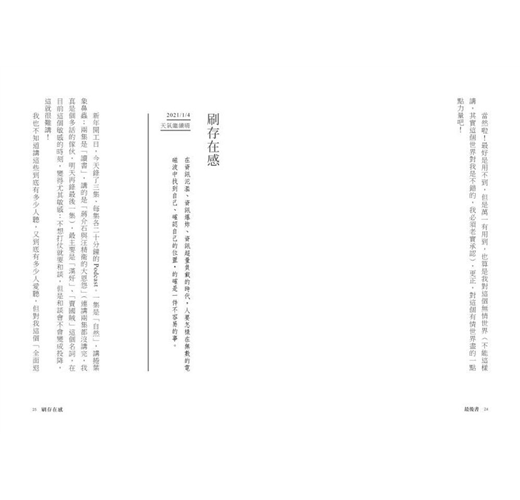 我很喜歡這些日記(倒不是我愛窺探他人隱私),從日常瑣事著眼,旁及人生哲學、自然科學等思維,讀來很有感觸。如首篇日記提到,作家深受耳鳴之苦,但醫生表示,已過治療期,勸慰病人只能與之「好好相處」。乍聽無奈,但其實人生何嘗不是如此?家庭、職場、生活總有不如意處,而這些無法輕易改變之處,與其哀怨度日,何不換個想法與之共處?第二天的日記作家更進一步談到與苦痛共處的方式:「人的感受會互為消長,能讓某一種感受多一些,原先(尤其是不好的)的感受就能少一些,或至少晚一些才來報到。」日常的苦痛不會驟然消失,但透過注意力的轉移,或許能減少不愉快的感受,也會讓我們生活好過一些。