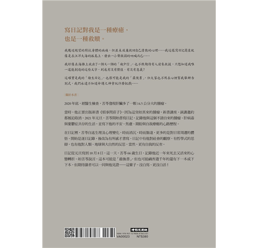 日記從元旦寫到10月8日,這一天,苦苓66歲生日,記錄他近一年來死去又活來的心態轉折。如苦苓說言,這本可能是「最後書」,但也可能禍害遺千年的還有下一本或下下本,但期待讀者可以一同與他見證——這輩子,沒白寫、更沒白活!