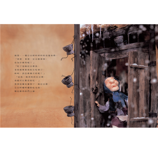故事中有許多地的狀聲詞接連出現,例如咕嚕咕嚕、咕嘟咕嘟、吧唧吧唧、呼哧呼哧、砰咚砰咚、骨碌骨碌、嘎登嘎登等等,這些狀聲詞在故事中創造了幽默趣味性,如果用有節奏感的聲調朗讀這些狀聲詞,可以讓孩子們更容易沉醉於古老的民間故事中。
