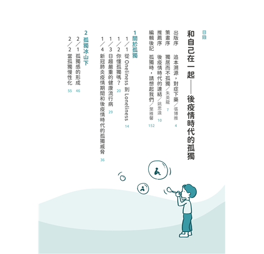 本書彙整了國內外與孤獨有關的文獻、介紹英美日澳等國預防孤獨的策略及活動、提供檢視孤獨的工具與指標,並採訪了心理學專家、精神科醫師及社會學、教育學背景等多位專家,提供如何預防或改善慢性孤獨造成的身心困擾,與提供建立社會連結、人際連結的方式。讀者可以解開所有關於孤獨的疑慮、與身心疾病的關連性,藉此也能反思自己身心處於甚麼狀態之下,是否深受孤獨影響。
