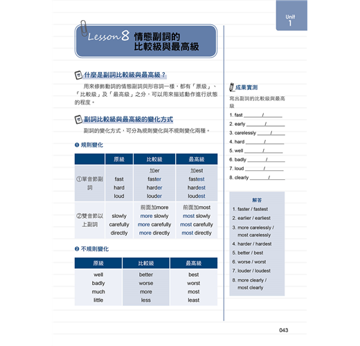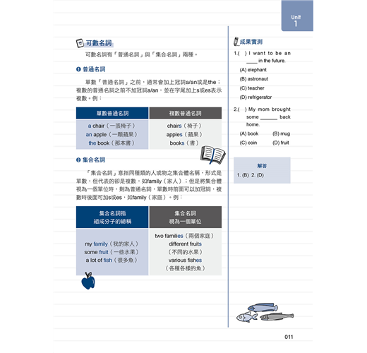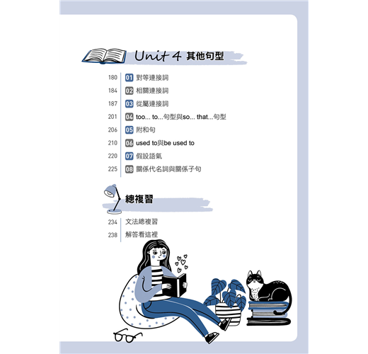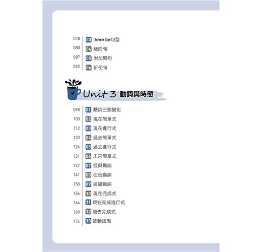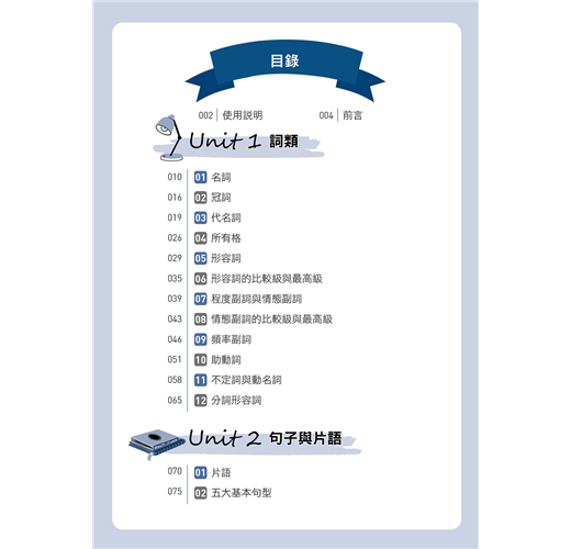 本書內容編排由淺入深,從最基礎的詞類介紹開始,分為「詞類」、「句子與片語」、「動詞與時態」、「其他句型」四個單元,循序漸進打造堅實文法基礎,零基礎也能讀懂英文文法!