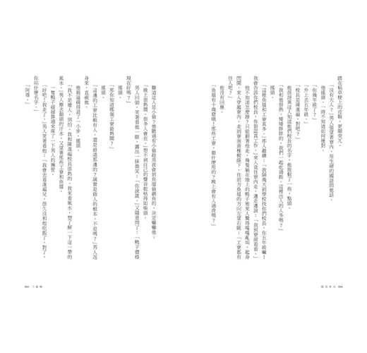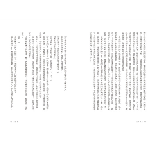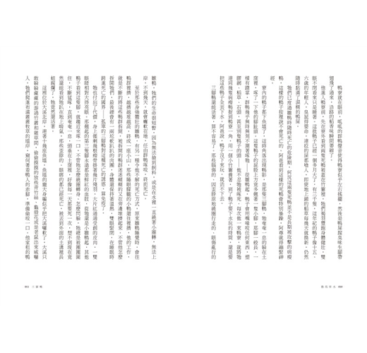 蒼蠅煩人。他不得不起來走動,看到寮角躲了一隻僅剩殘羽的病鴨,嘴喙一半黑一半白,「黑白郎君」—─他腦裡閃過最近布袋戲裡的角色,這就是牠的名字。為何我沒有為鴨子取過名字?爸媽養了十幾年的鴨子,也從來沒有為任何一隻鴨子取過名字,有時阿爸要講某隻鴨子,就描述牠,例如:「彼隻喙仔予鐵網刺傷的、白灰白灰的」或是「一直落屎,黑尻脊的那隻」,幾天後那隻鴨子就被遺忘。這些病瘦鴨子,如果有了名字,他就更能清楚的辨識牠們,了解牠們是否還活著。三腳鴨不就是個名字了,他看到一隻全身灰羽的瘦鴨,就叫牠「六合」,這會不會太誇張了,男主角耶!管他的,就是「六合」;對了,有一隻駝背的無羽鴨就取名「祕雕」,功夫萬底深坑的神祕「祕雕」,多好的名字。他決定繞一圈找出這隻「祕雕」。