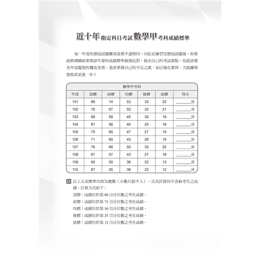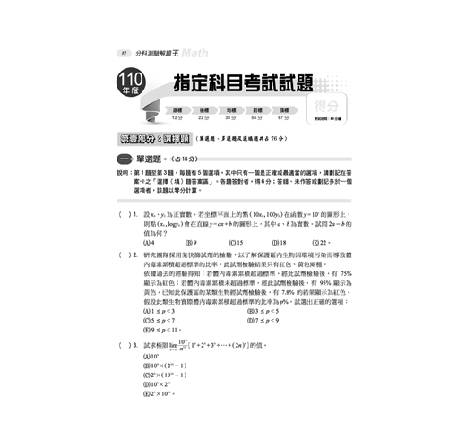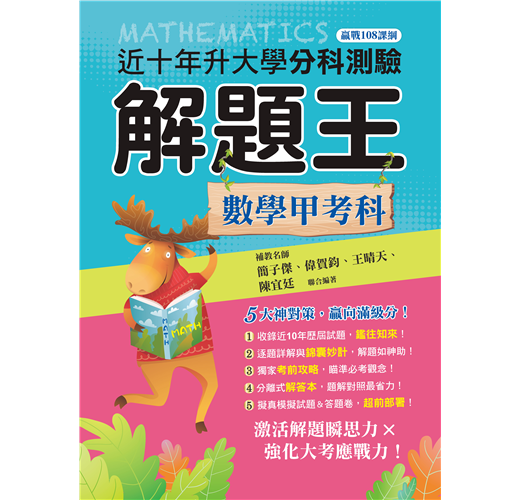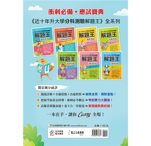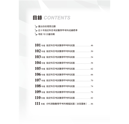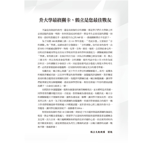 分科測驗取代了原來的指考,由原本的十科縮減成七科,目的在檢視同學是否具有大學校系所要求的學科的深廣能力。且在採計科目上,各校系會從學測、分科測驗、術科考試中取3至5科作為採計科目,分科測驗至少採計1科,想依循「考試分發」進入理想大學的話,分科測驗的準備必然不能鬆懈。有鑑於此,本系列收錄近10年歷屆試題,除了鑑往知來,還提供同學最充分的演練題庫,相信在經過10年份的歷屆試題洗禮下,自身實力能更上一層。
