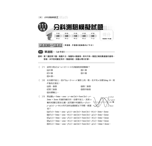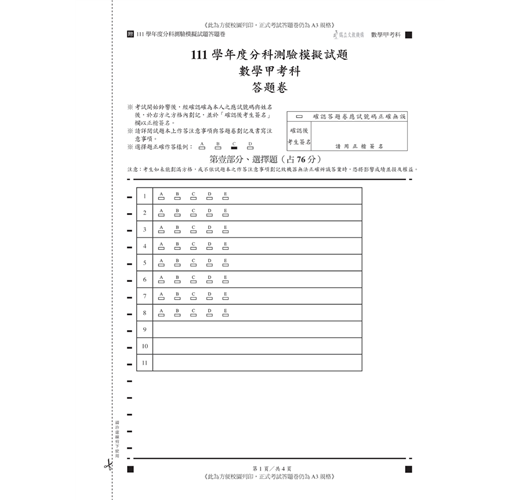 111年度分科測驗數學甲考科模擬試題(含答題卷)