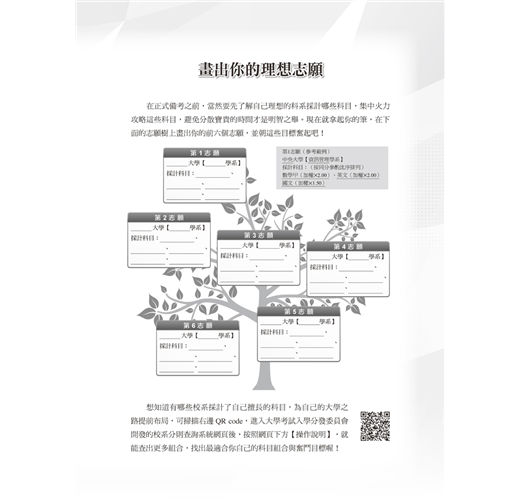 俗話說得好:「Where there is a will there is a way.」,一旦堅定目標,你就會想盡辦法去實現,因此,開始備考之前,當然要先了解自己理想的科系要採計哪些科目,集中火力攻略這些科目,才是成功的最佳途徑,鶴立團隊特別設計了一頁理想志願樹,讓大家在這棵大樹上,填上自己的前六個志願,期望大家最終都能達到自己的目標!