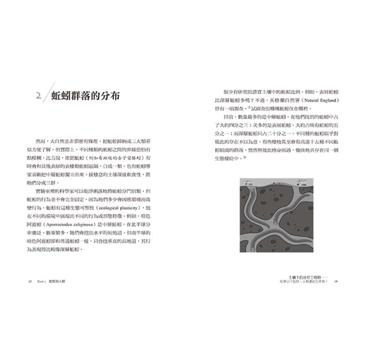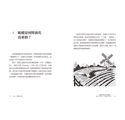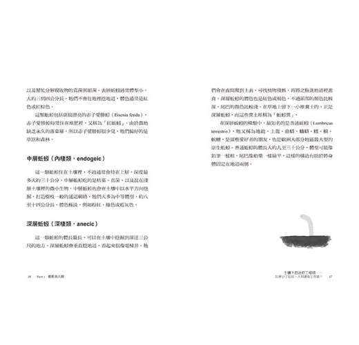 然而,大多人對土壤中這些神奇的工程師幾乎一無所知。我們對蚯蚓視而不見,但少了蚯蚓,世上就會了無生息。全球的土壤都會荒廢──我們的園子、田野和農場種不出食物,無法支撐我們賴以生存的作物和牲畜。蚯蚓不只會回收腐爛的植物,讓養分回歸土壤,由於不斷扭動、挖掘,也幫助雨水滲透,而且是狐狸、青蛙等各種野生動物的食物。近期的研究甚至顯示,蚯蚓能幫忙清理受污染的土地,讓土地再度肥沃、富饒。