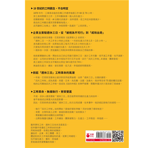 「安德魯.巴恩斯說雇主無力測量員工真正的產值,只好用機械式的工時估算價值,真是一針見血!若要避免人被工時消耗到只剩下沮喪,從一週四天工作中重建幸福感,...