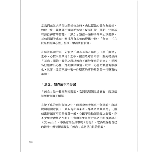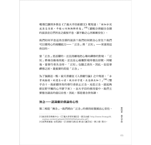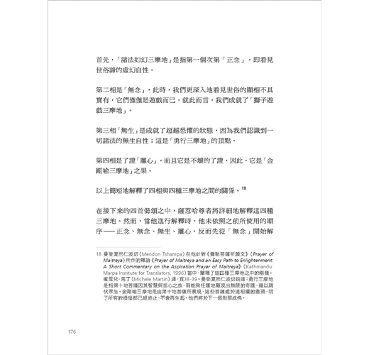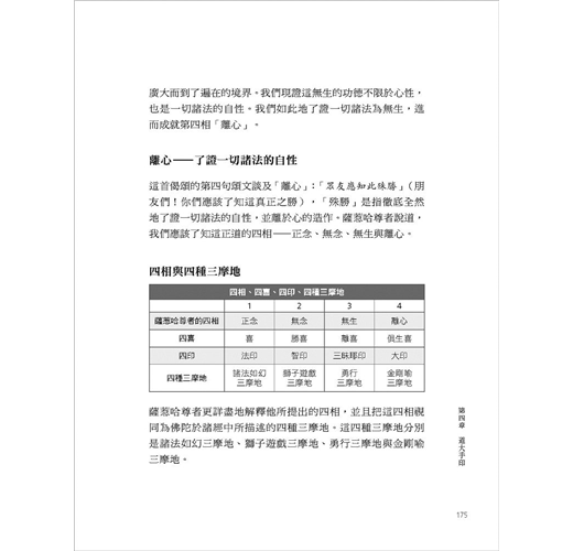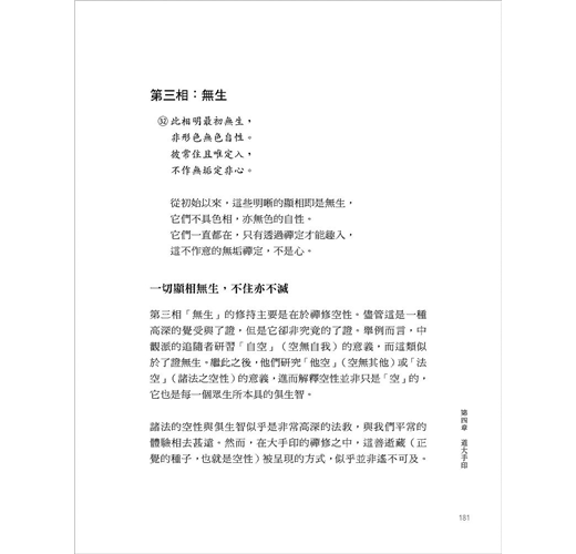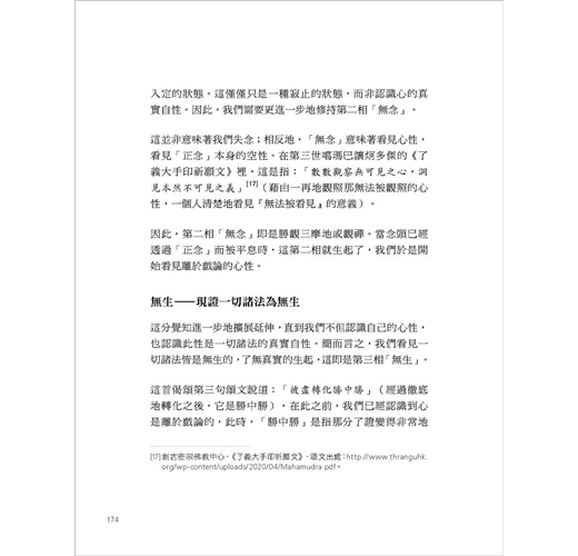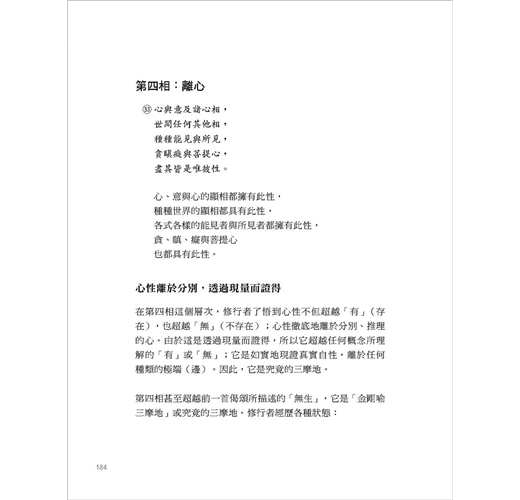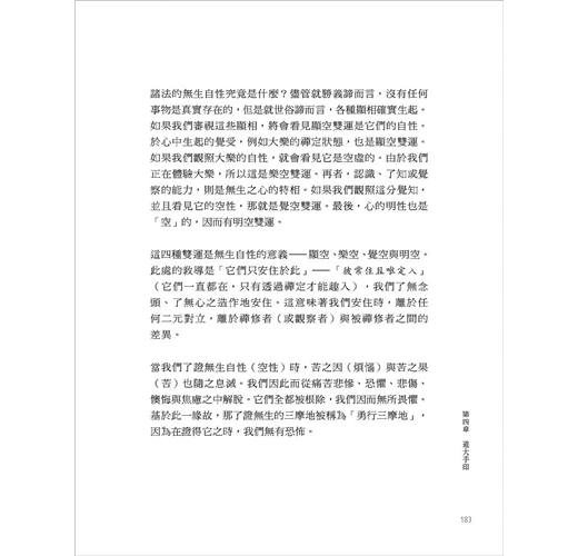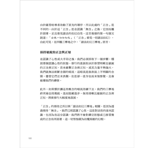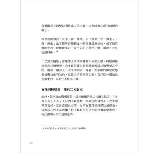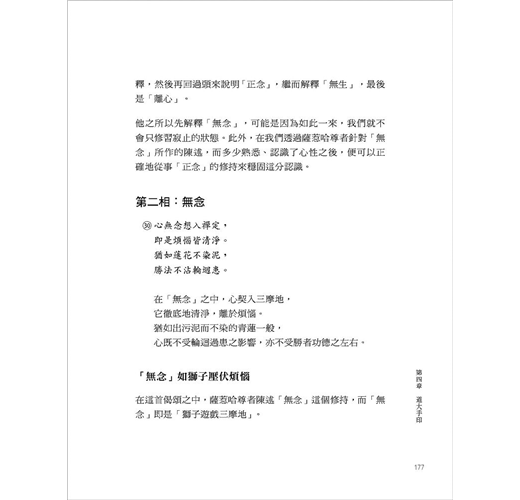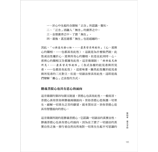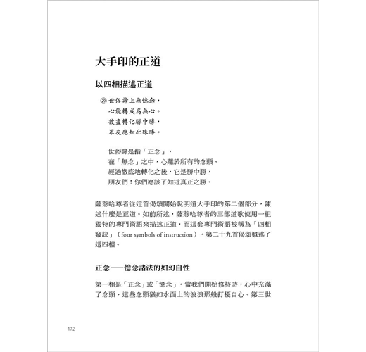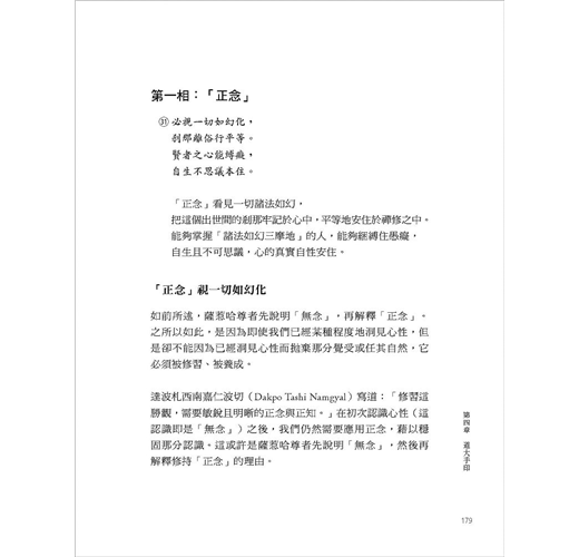 在道大手印中,尊者教導「正念」、「無念」、「無生」、「離心」四個修行次第。但尊者在本書中對調了前兩個次第,首先是藉由深刻的勝觀——「無念」,以品嚐離於煩惱的滋味。接著,應用「正念」以穩固對心性的認識,並看見諸法的如幻自性,進而觀見一切諸法皆是「無生」。最後,超越概念造作的心——「離心」,而回歸到一直都在的原點——無垢的心性。