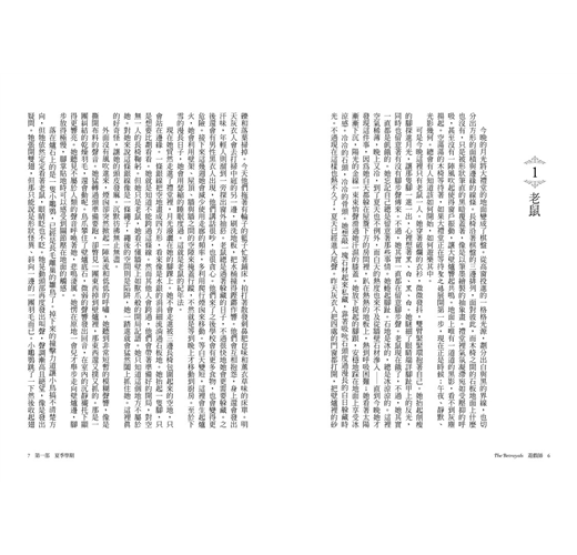可是今晚這裡只有老鼠一人。她穿著破爛的衣衫,微微發抖,雙臂緊緊環抱著自己。她抬起削瘦的腳探進月光,讓那隻腳一進一出,心裡想著黑、白、黑、白。她瞇細了眼睛端詳腳指甲上的反光,同時也留意著有沒有腳步聲傳來。不過,她其實一直都在留意腳步聲。老鼠現在餓了,不過,她其實一直都是饑餓的。她忘記自己總是留意著那些事情。她蜷起腳趾。石地是冰的,總是冰涼涼的。這裡空氣稀薄,晚上又冷,到了夏天也不例外,而白天的熱度也來不及從牆壁石材滲入──直到今晚她才發現這件事,因為她白天都躲在屋簷下方的房間裡,趴在熱熱的地板上,熱到呼吸困難;她看著太陽漸漸下沉,陽光的金線一束束悄聲滑過她汗濕的膝蓋。她放下提起的腳跟,安穩地踩在地面上享受冰涼感。冷冷的石頭,冷冷的骨頭。她想敲一塊石材起來私藏,靠著吸吮石頭度過漫長的白日躲藏時光。不過現在這樣也熱不久了,夏天已經進入尾聲。昨天灰衣人把四處的門窗都打開,把壁爐裡的砂礫和落葉掃掉。今天他們拖著有輪子的籃子忙著鋪床,拍打著散發刺鼻肥皂味和薰衣草味的床單。明天灰衣人會去打掃中庭的另一邊,刷洗地板,把水桶撞得鏗鏘作響。他們會互相抱怨,身上還會發出汗味,年輕人則溜到一旁探出窗外抽菸。老鼠總是過著躲藏的日子,不過很快地她會更需要躲藏。之後還會有男性黑衣人出現,他們講話很吵,也很貪心。他們來了之後學校會有更多食物,也會變得更危險。接下來這幾週她會減少使用走廊的頻率,多利用爬行煙囪來移動。等白天變短,這裡會升起爐火,她會利用壁架、屋頂、牆與牆之間的空隙來掩蓋行蹤,不然就是等到晚上才移動到廚房。至於下雪的漫長日子,她會用瑟縮的睡眠度過。這就是老鼠的紀年法。