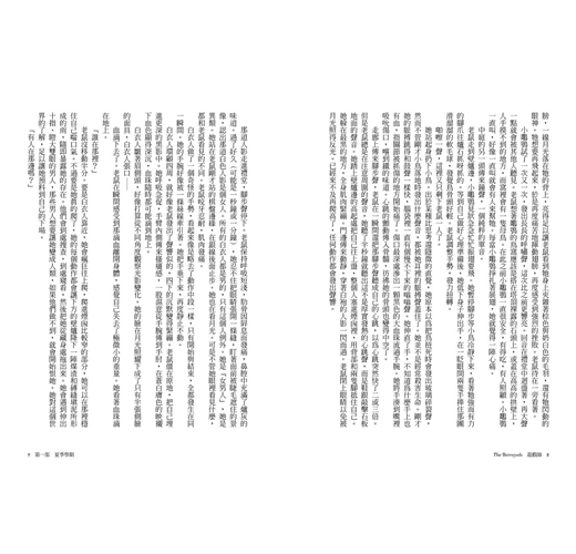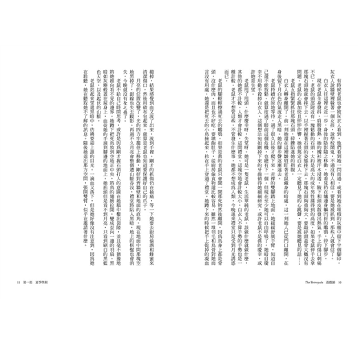 那道人影走進禮堂,腳步聲停下。老鼠保持呼吸短淺,肋骨因屏息而發痛,鼻腔中充滿了爐灰的味道。過了好久(可能是一秒鐘或一分鐘),她忍不住把眼睛張開一條縫,盯著面前被睫毛遮住的景像,認出那道白色人影是個女人。所有的白衣人都是男的,只有這個人例外。她是「女男人」,她是異類。她站在老鼠剛才站的棋盤邊緣,在銀線後面止步。她也在看月光。可是不管她眼裡看見什麼,都和老鼠看見的不同。老鼠咬牙忍耐,肌肉發痛。