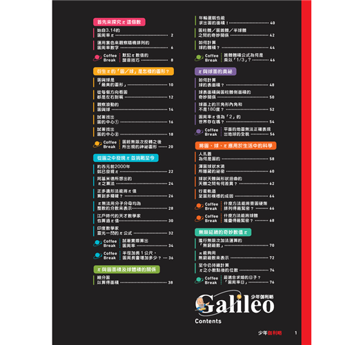圓周率還有很多值得探究的奇特性質,例如:在特定的條件下,甚至會出現圓周率變為「2」的情形;無法做出十分完美的世界地圖,跟地球是球體有很大的關係……自古以來就有不少數學家絞盡腦汁要破解π的無窮祕密,而人們對於這個神祕數值的著迷至今依然盛行。藉由閱讀本書,可以對圓周率有更深一層的認識,歡迎一同沉醉於深不可測的幾何世界魅力。