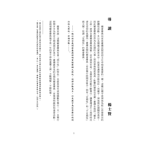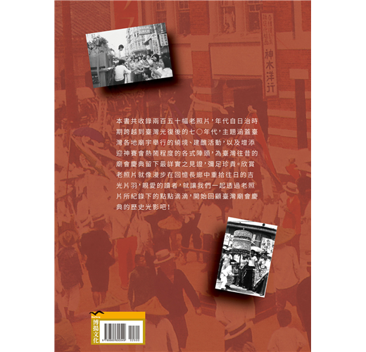 本書共收錄兩百五十幅老照片,年代自日治時期跨越到臺灣光復後的七○年代,主題涵蓋臺灣各地廟宇舉行的繞境、建醮活動,以及增添迎神賽會熱鬧程度的各式陣頭,為臺灣往昔的廟會慶典留下最詳實之見證,彌足珍貴。