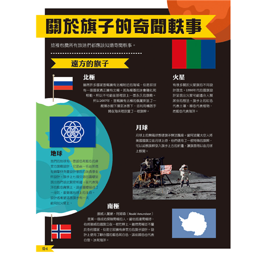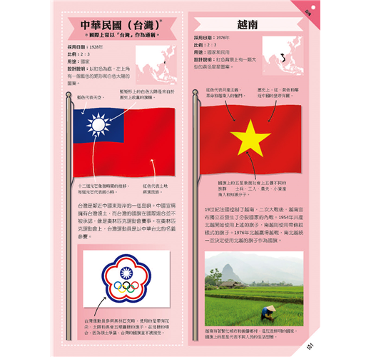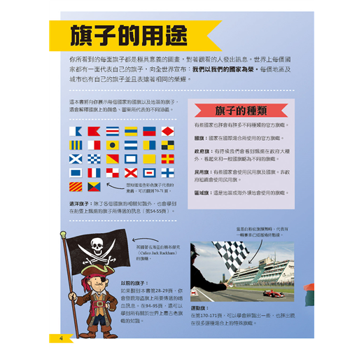 名人推薦:這本書很棒!內頁色彩豐富,描述每個國家/地區及其旗幟的大量資訊,甚至還有船艦旗幟的內容。淺顯易讀。我的兒子對此書愛不釋手。──Reviewer94
