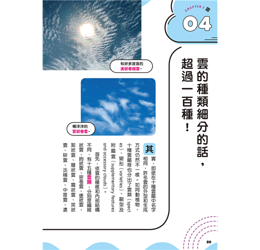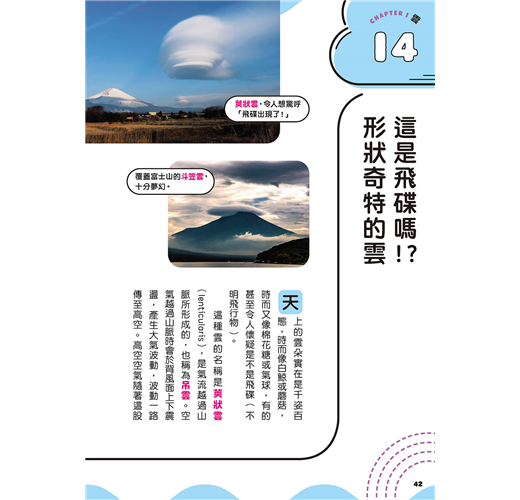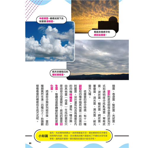 ◎雲朵每分每秒都在改變形狀,有的像飛碟,有的像羽毛,有的甚至像蛋糕捲,只要觀察天空中雲的變化,就能知道即時的天氣變化。