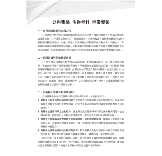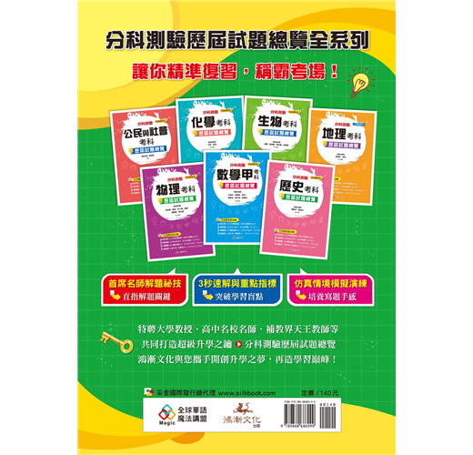 有別以往的考試題型,分科測驗新增「混合題型」與「卷卡合一」,題目素材多引用生活或學術探究情境,測試學生整合運用、閱讀理解、圖表判讀、邏輯推理以及證據引用之能力。綜觀近年的指考亦朝向此趨勢命題,故欲在分科測驗中奪得佳績,演練歷屆試題絕對是最佳良方!鴻漸文化《分科測驗歷屆試題總覽》系列收錄近5年歷屆試題+3回擬真模擬試題,特聘大學教授及補教界名師群,包括王晴天、簡子傑、劉河北、葉施平、徐明軒、林全、余紫瑛、林冠傑、莫旻、王宇、邱天、蔡任圃、吳雅嵐老師等等,陣容堅強自不在話下,以獨特且精闢的觀點深入剖析每道題目,題題詳盡解析,讓同學可以「知其然,更知其所以然」,讓您在練習題目時也能做好全方位複習!