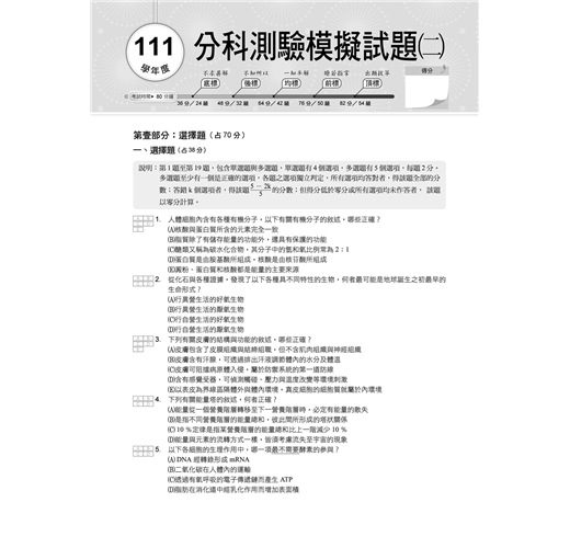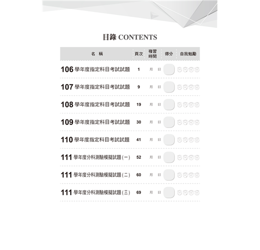 為了幫助同學們熟悉分科測驗的命題方式,特聘補教權威名師針對最新命題趨勢、網羅各類題庫,輔以Learning Analytics統計,編寫3回模擬試題讓學子們實戰演練,並輔以擬真的卷卡合一答案卷拉頁,提前熟悉應試作答的技巧,掌握得分關鍵,馳騁考場、傲視群雄!