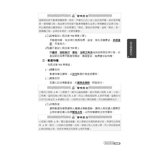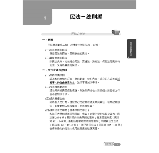 民法是萬民之法,生活中大大小小的事情都與民法脫離不了關係,但也因為民法條文繁多,加上本身難度就偏高,所以往往會成為考生的夢靨,雖然民法很難,但跟著老師的腳步,會發現民法其實很有趣,個人認為讀民法的要點是:理解>背誦,基本條文(七大請求權基礎、物權等)肯定得熟背,但其他條文只要能照法條的意思表達出來,基本上分數不會少到哪去,故讀民法時當天上完課一定要兩天內複習完畢,趁印象深刻時加強記憶,並且將老師的體系表記憶起來,定能於應付許多題目時遊刃有餘,故讀民法時首要應當是建立自己法學架構,根深蒂固以後再開枝散葉,背誦其他的條文。