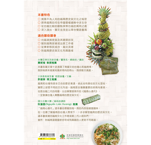 ◎「心適代」是台語,意指「新鮮、有趣、不為人知的事或秘密」。本書的目的就是要介紹越南歷史及文化當中,較不為人知的心適代,以便讀者可以更加全面地認識越南。