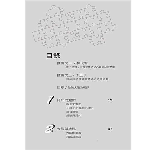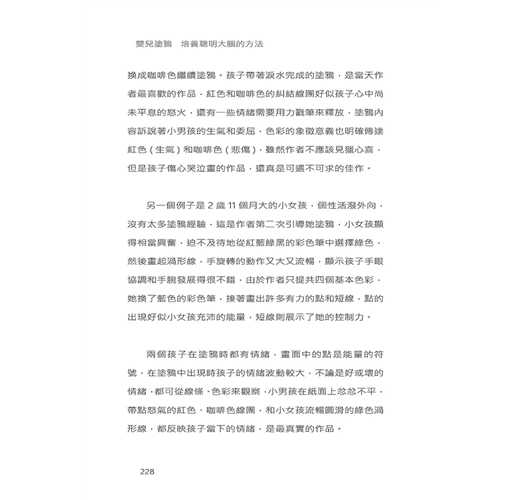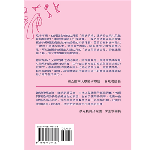 你若是為人父母或嬰幼兒的教師,這本書會是一個認識嬰幼兒身心發展與認知運作的好書,在作者生動有趣的解說與優美流暢的敘寫下,你會在不知不覺中進入幼兒的塗鴉世界,更重要的是,你將能透過「塗鴉」來引導嬰幼兒表達生活中的點滴並進而啟動他/她的生命活力。