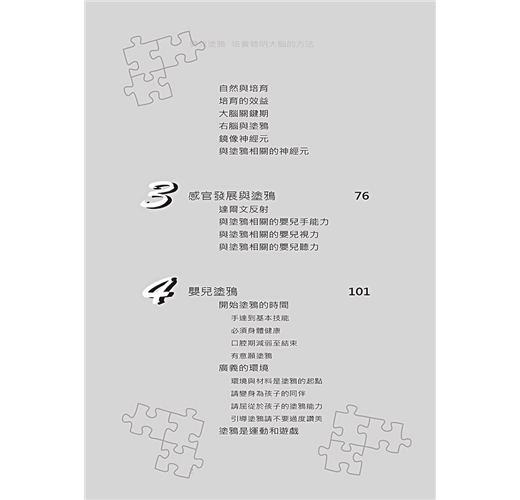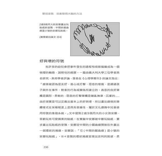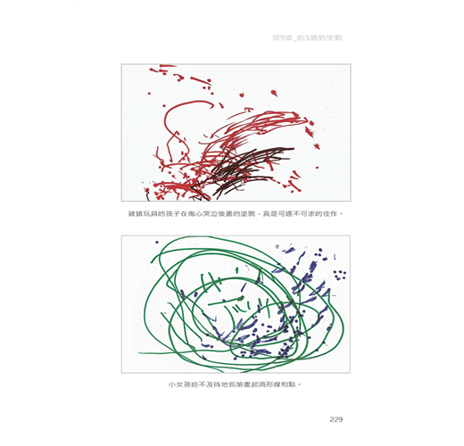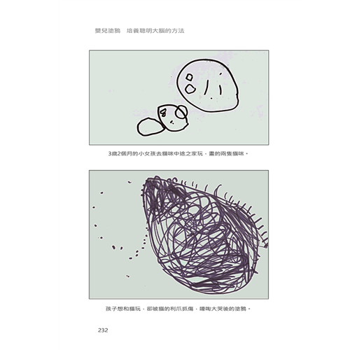 第一本介紹嬰兒塗鴉的專書。塗鴉刺激大腦內神經元數量、突觸聯結,「用進退廢」的情況就像似一個小型迴圈,嬰兒越塗鴉,越刺激神經元和突觸,助益大腦的發展。適當且具效益的塗鴉增進嬰兒的智力表現,參照動物實驗可達15%以上,這讓孩子未來的學習更順利。書中介紹鏡像神經元(mirror neuron),並藉著它的機制引導嬰兒塗鴉。由於人類生命初期的可塑性最大,在3歲的關鍵期來臨之前,掌握時效性讓嬰兒塗鴉提升孩子智力的最大進步。書中的文字主要是作者長久以來的研究,和許多孩子的真實成長內容。推廣嬰兒塗鴉,提升兒童大腦發展是本書的目的。