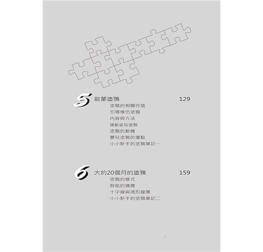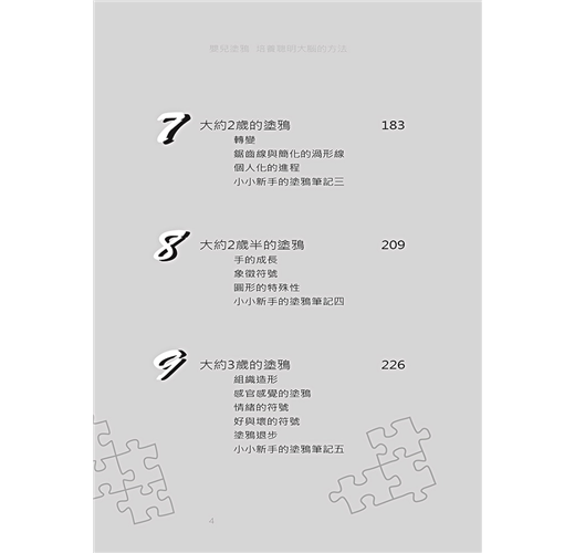 本書參考「Child Development」註2把2個月至24個月大分類為嬰兒,每半年為一個階段詳述嬰兒的發展,嬰兒期總共四個階段。在本書中2歲以後的孩子通稱為幼兒,沒有特意使用學步兒來分類,而是以實際年齡區隔塗鴉表現。作者建議12至15個月大的嬰兒開始塗鴉。但是尚在嬰兒期的新生命,真的有能力塗鴉?會太早塗鴉?這是大部分人心中的疑慮,這些疑慮就像做研究的假設,需要深入討論。由於作者長時間引導兒童創作,有許多機會接觸各種年齡的幼兒,更進一步研究大腦發展和神經元運作,發現從培育的觀點塗鴉是培養大腦的好方法,孩子們也從中獲得樂趣和滿足。